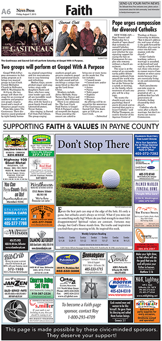 Sponsors who want to continue in Black & White aren't forced to pay the extra $5.00 per week but in the past year all but a handful are paying the higher rate now. The newspaper has chosen to continue its free Church Directory in the weekly Religion Section. Let us tell you how we did it or better yet, contact the Publisher, Dale Brendel at (405) 372-5000 Ext. 290 or publisher@stwnewspress.com to find out more.